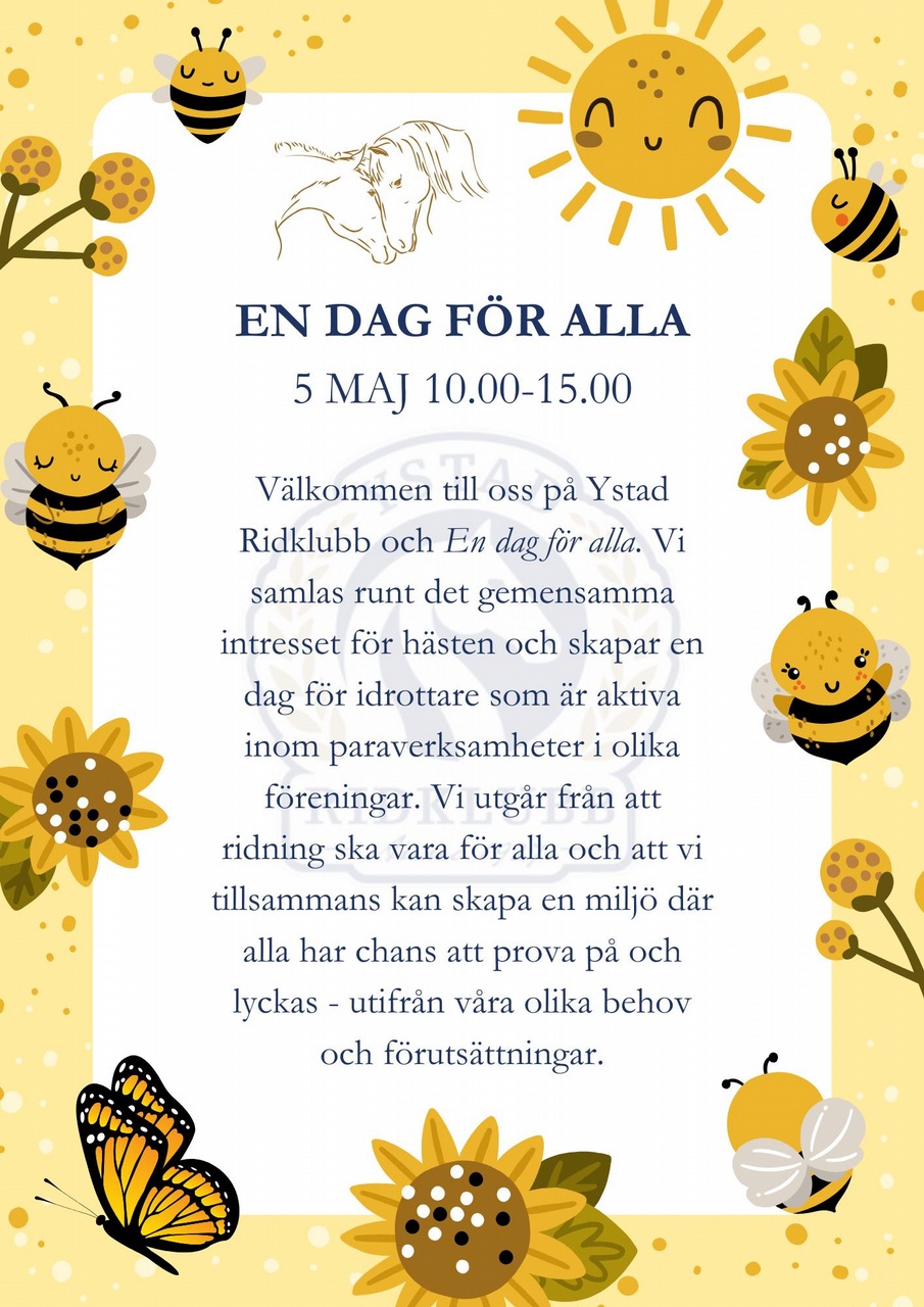 Den 5 maj är ni välkomna till oss på Ystad Ridklubb för en dag som består av värme, glädje och kärlek till häst. Dagen bjuder på en ridaktivitet likt en hinderbana/WE-bana där det finns tre olika klasser, utifrån varje enskild individs förutsättningar och nivå, som är öppen våra ridande som rider i paraverksamhet samt för ridande på andra ridskolor med paraverksamhet. Ni hittar mer information om hur ni anmäler er på bilderna.